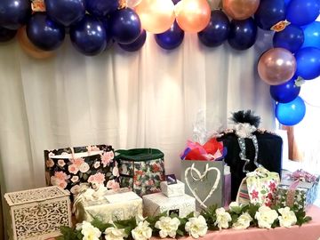 The hosting bridal party requested a balloon and floral backdrop for the gift table